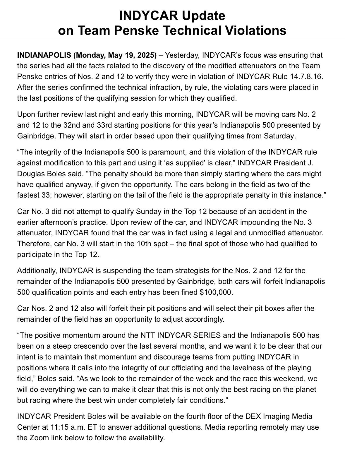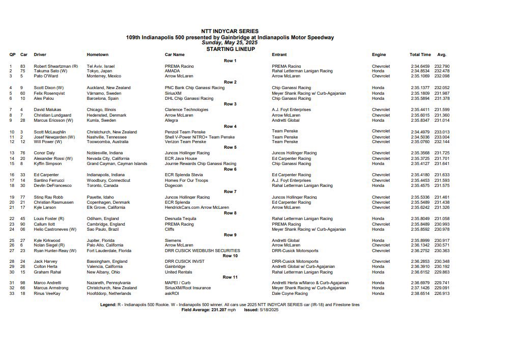 - Sun. 5/25/2025: Starting Grid (REVISED)