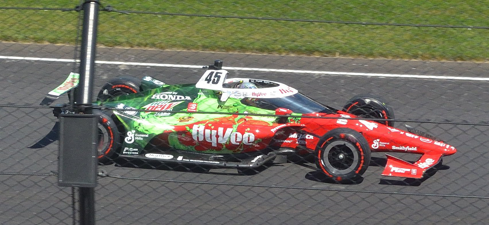 Only one car had a significant amount of green in its livery. Santino Ferrucci (Rahal Letterman Lanigan Racing) drove the #45 HyVee/Mountain Dew entry. The car was red with green “splash” graphics. It also had white lettering and white trim on the aeroscreen. He led two laps and finished 6th.