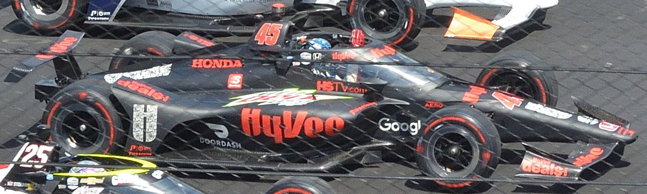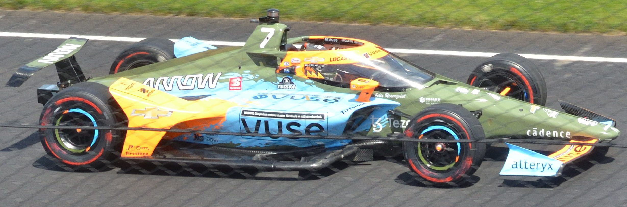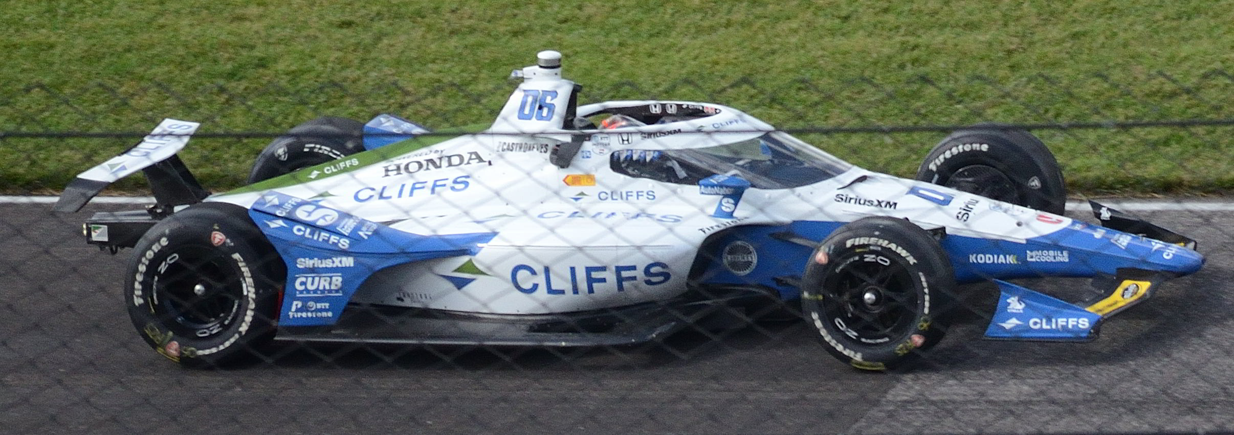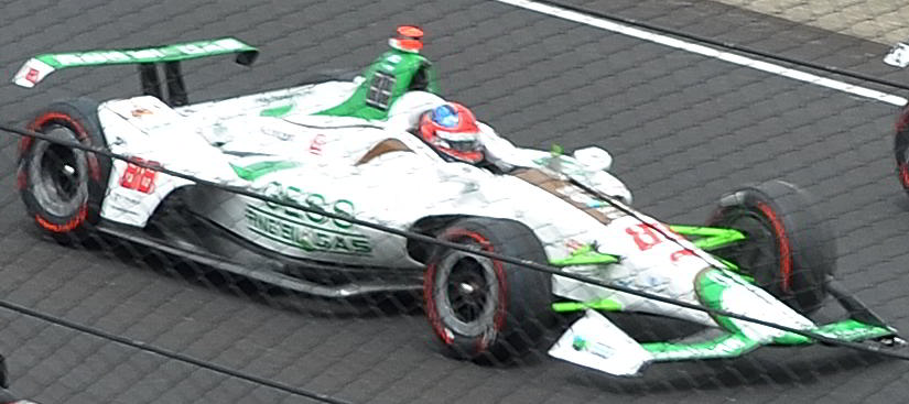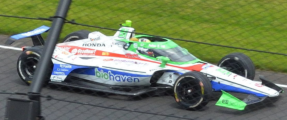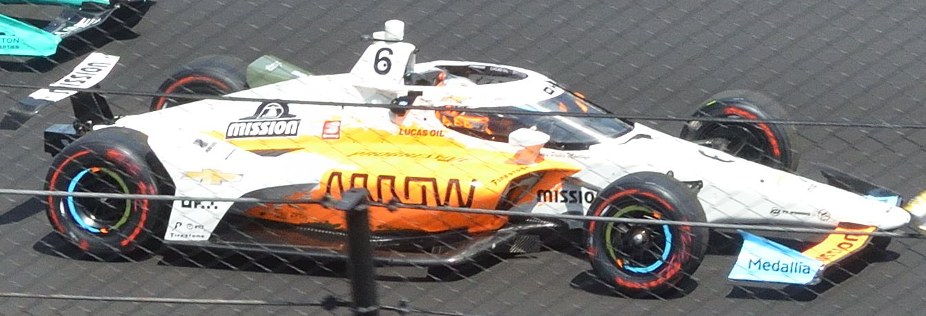 Marcus Armstrong’s car was the first solid green car since Danica Patrick’s in 2018. He dropped out with mechanical problems after only 6 laps. After running a few years with a black and pink car, Helio Castroneves’ livery changed to white and blue. His sponsor Cleveland-Cliffs had a little bit of green in its logo, and some green trim was seen on the car. He started 20th and finished 20th, and was not much of a factor on the day.