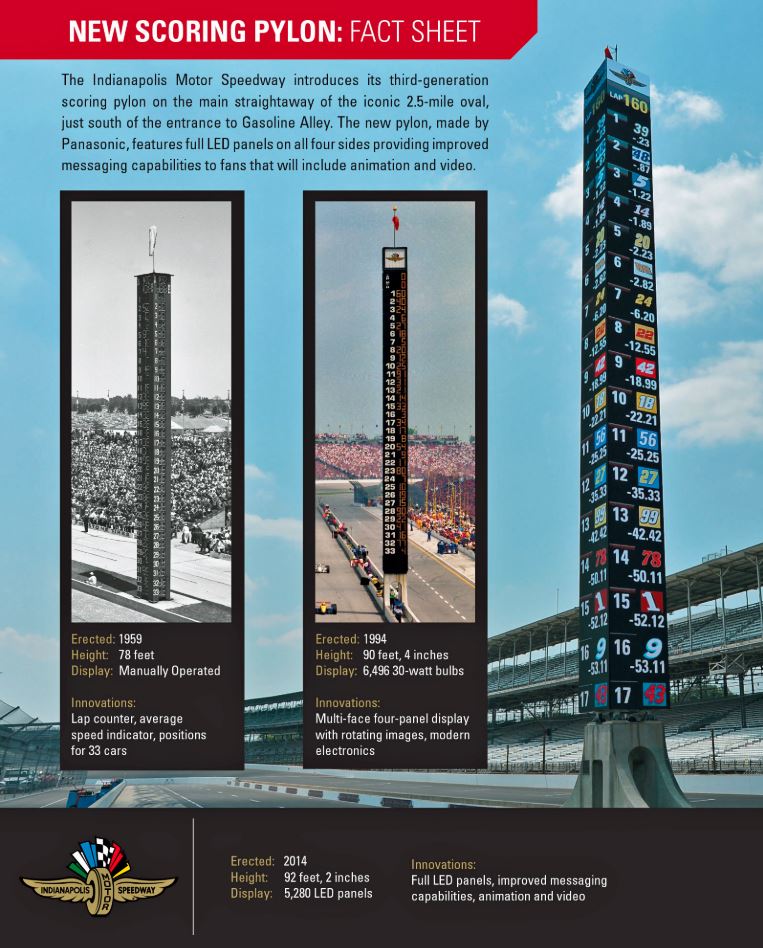 A famous icon along the frontstretch of the Indianapolis Motor Speedway is the scoring pylon. The Original Pylon was erected in 1959. It was four-sided, and showed the running order of all 33 cars, as well as lap and speed. The original pylon stood 78 feet tall, had 6,048 incandescent light bulbs, and was manually operated from the Master Control Tower. By 1982, computers were employed to assist in the operating the display. A wind sock was installed on the top to provide clues on the wind direction.